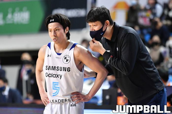 6일 전주실내체육관에서 열린 2021-2022 KGC인삼공사 정관장 프로농구 전주 KCC와 서울 삼성 경기. 삼성 이규섭 감독 대행이 김시래에게 개인 지시를 하고 있다.