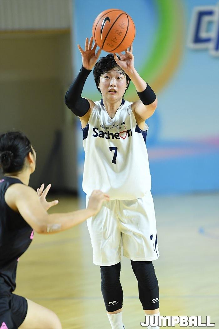 [점프볼=김천/유용우 기자] 10일 김천실내체육관에서 열린 2021 전국실업농구연맹전 사천시청과 대구시청의 경기, 사천시청 윤나리가 슛을 던지고 있다.