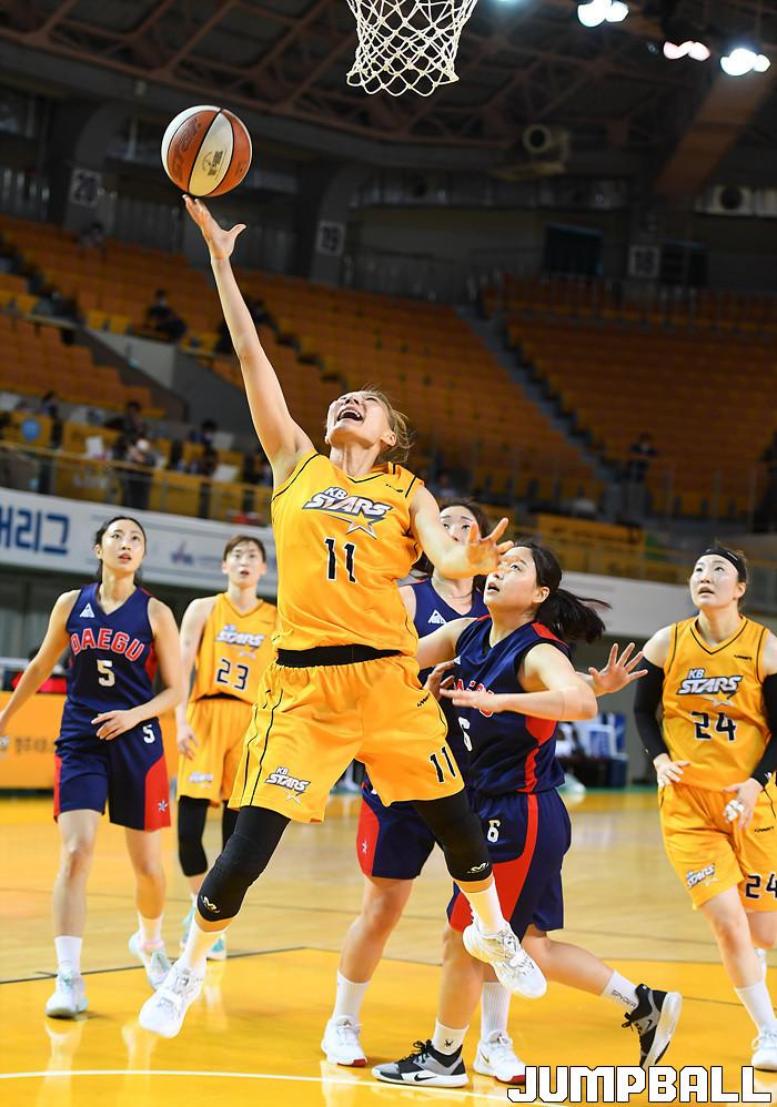[점프볼=청주/문복주 기자] 16일부터 21일까지 청주체육관에서 '2020 우리은행 박신자컵 서머리그' KB스타즈와 대구시청의 경기, KB스타즈 최희진이 골밑을 장악하고 슛을 시도하고 있다.