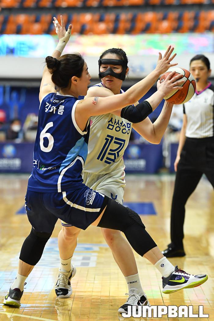 [점프볼=인천/유용우 기자] 17일 인천 도원체육관에서 열린 'KB국민은행 Liiv M 2020~2021 여자프로농구' 신한은행과 삼성생명의 경기, 신한은행 김아름과 삼성생명 김단비가 공수대결을 펼치고 있다.