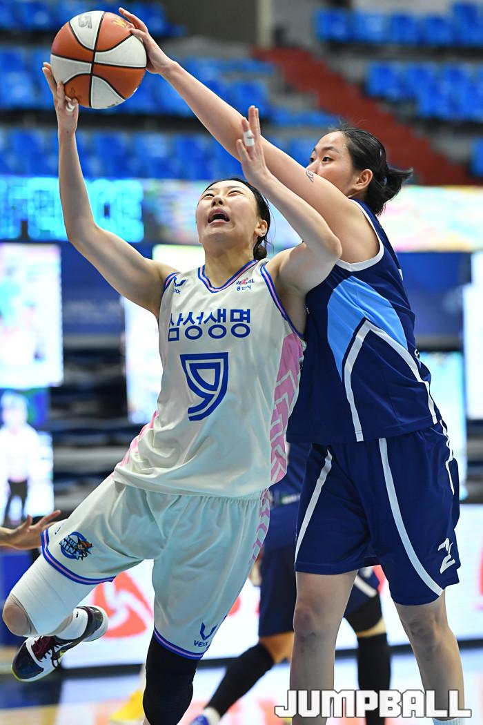 [점프볼=인천/유용우 기자] 17일 인천 도원체육관에서 열린 'KB국민은행 Liiv M 2020~2021 여자프로농구' 신한은행과 삼성생명의 경기, 신한은행 한엄지가 삼성생명 박혜미의 슛을 블록으로 저지하고 있다.