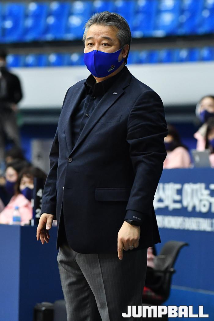 [점프볼=인천/유용우 기자] 17일 인천 도원체육관에서 열린 'KB국민은행 Liiv M 2020~2021 여자프로농구' 신한은행과 삼성생명의 경기, 삼성생명 임근배 감독이 작전을 지시하고 있다.