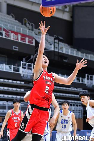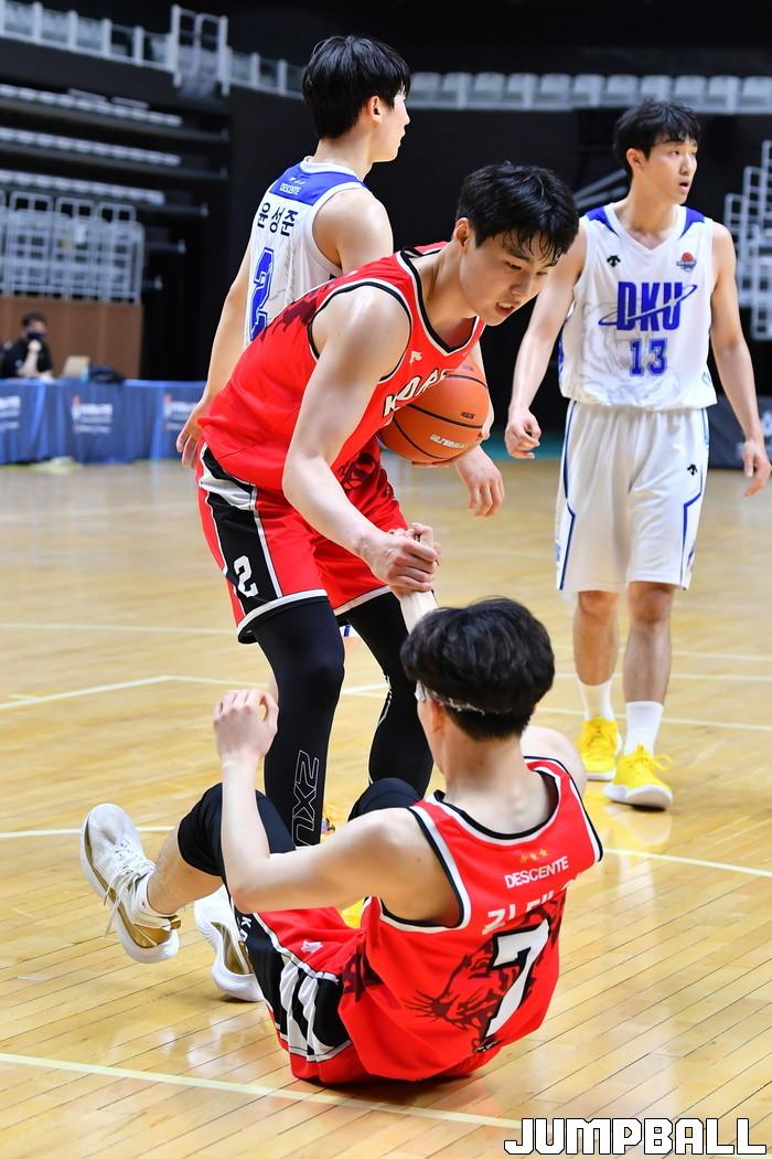 [점프볼=수원/홍기웅 기자] 6일 수원 서수원칠보체육관에서 열린 '2021 KUSF 대학농구 U-리그 3차대회' 단국대와 고려대의 경기. 고려대 신민석이 넘어진 김태완을 일으키고 있다.