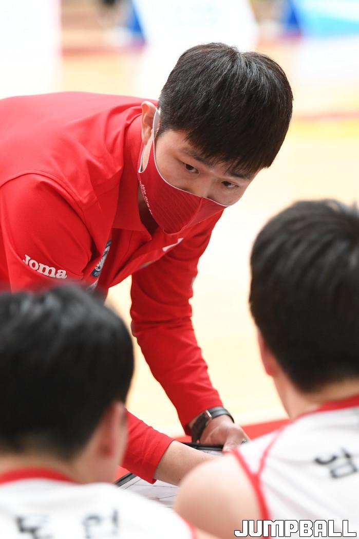 17일 이천에 위치한 LG 챔피언스파크에서 열린 2021-2022 KBL D리그 울산 현대모비스와 대구 한국가스공사의 경기, 한국가스공사 강혁 코치가 작전 지시를 하고 있다.