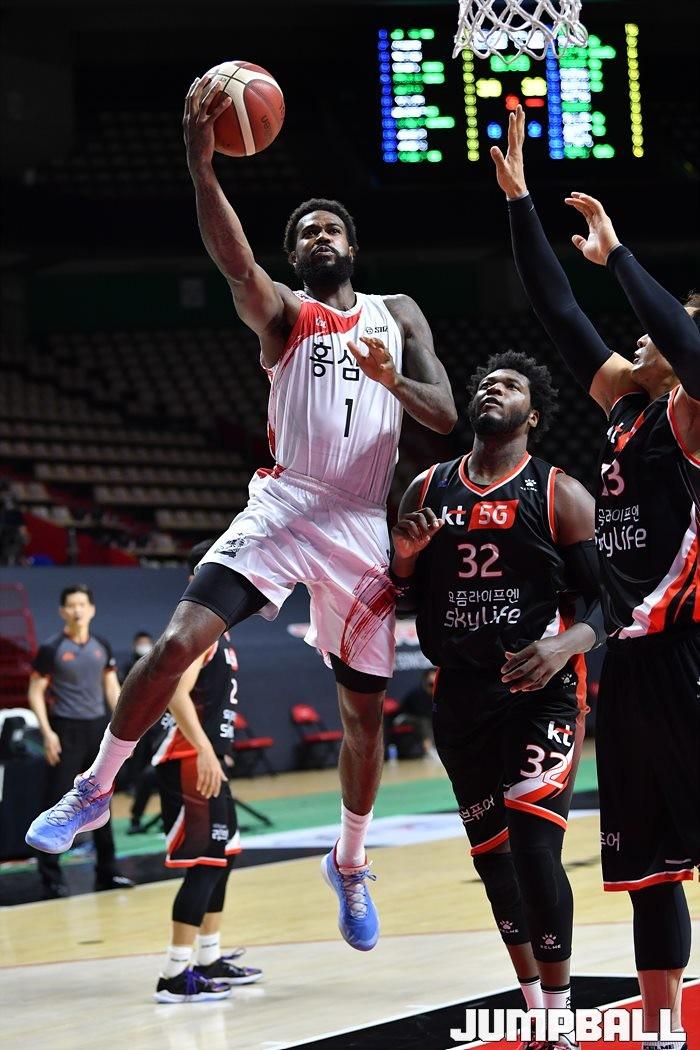 [점프볼=부산/유용우 기자] 22일 부산 사직실내체육관에서 열린 '2020-2021 현대모비스 프로농구' 부산 kt와 안양 KGC인삼공사의 경기, KGC 얼 클락이 공격을 시도하고 있다.