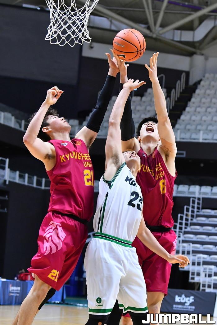 [점프볼=수원/홍기웅 기자] 5일 수원 서수원칠보체육관에서 열린 '2021 KUSF 대학농구 U-리그 3차대회' 경희대와 건국대의 경기. 경희대 이사성이 리바운드를 잡아내기 위해 점프를 뛰고 있다.