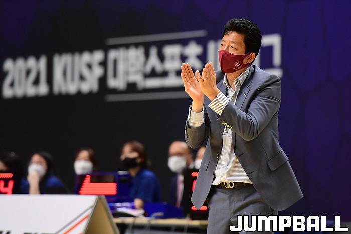 [점프볼=수원/박상혁 기자] 26일 서수원칠보체육관에서 열린 2021 KUSF 대학농구 U리그 동국대와 경희대 경기, 경희대 김현국 감독이 선수들을 독려하고 있다.