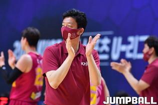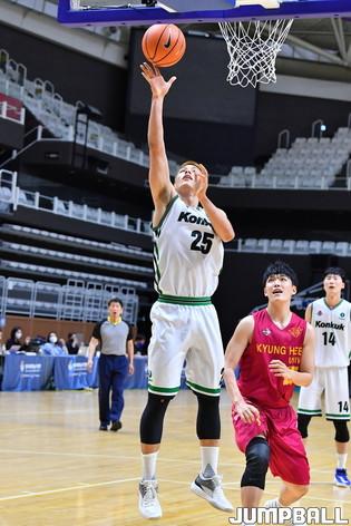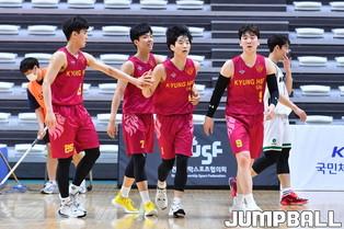 [점프볼=수원/홍기웅 기자] 5일 수원 서수원칠보체육관에서 열린 '2021 KUSF 대학농구 U-리그 3차대회' 경희대와 건국대의 경기. 경희대 황영찬이 뒤에서 오는 동료를 향해 노룩 백패스를 건네고 있다.