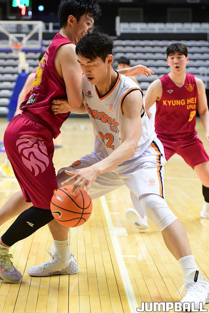 [점프볼=수원/박상혁 기자] 26일 서수원칠보체육관에서 열린 2021 KUSF 대학농구 U리그 동국대와 경희대 경기, 동국대 조우성이 공격을 시도하고 있다.