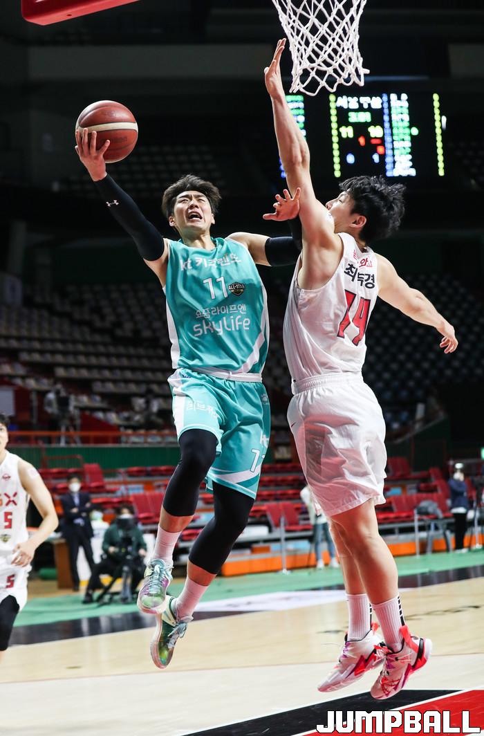 [점프볼=윤민호 기자]7 부산 사직체육관에서 열린 2020-2021 현대모비스 프로농구 부산 KT 서울 SK 경기에서 KT 양홍석이 SK 최부경의 수비를 피해 슛을 하고 있다.