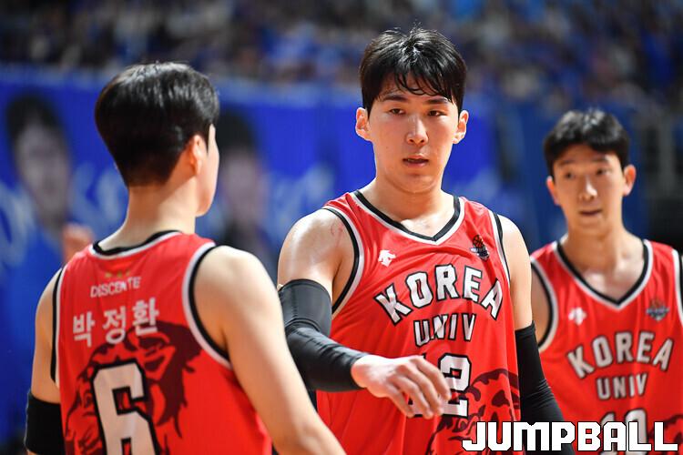 28일 고양실내체육관에서 열린 고려대와 연세대의 2022 정기전, 고려대 문정현이 박정환을 격려하고 있다. [점프볼=고양/유용우 기자]