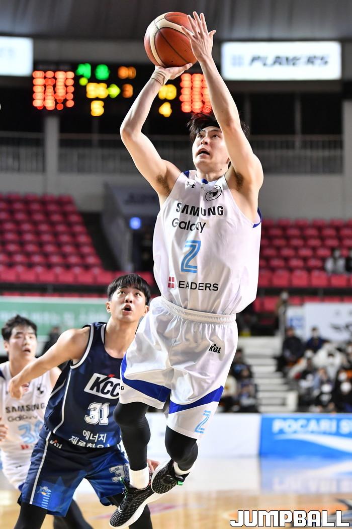 6일 전주실내체육관에서 열린 2021-2022 KGC인삼공사 정관장 프로농구 전주 KCC와 서울 삼성 경기. 삼성 이호현이 골밑슛을 던지고 있다.