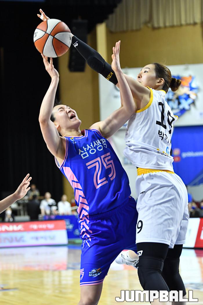 [점프볼=용인/유용우 기자] 09일 용인실내체육관에서 열린 'KB국민은행 Liiv M 2020-2021 여자프로농구' 용인 삼성생명과 청주 KB의 챔피언결정전 2차전, 삼성생명 배혜윤의 공격을 KB 박지수가 블록으로 저지하고 있다.