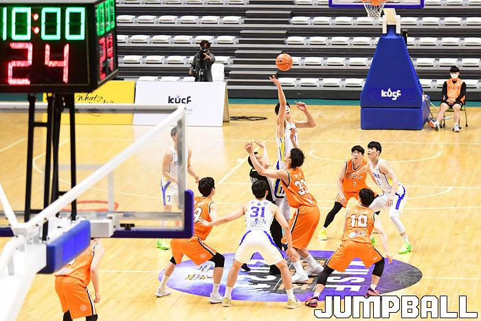 [점프볼=수원/박상혁 기자] 4일 서수원칠보체육관에서 열린 2021 KUSF 대학농구 U리그 연세대와 동국대의 경기, 점프볼로 경기가 시작되었다.