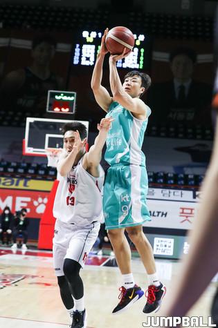 [점프볼=윤민호 기자] 20일 사직실내체육관에서 열린 2020-2021 현대모비스 프로농구 부산 KT와 울산 현대모비스의 경기에서 현대모비스 숀롱이 KT 알렉산더의 수비를 피해 슛을 하고 있다.