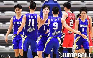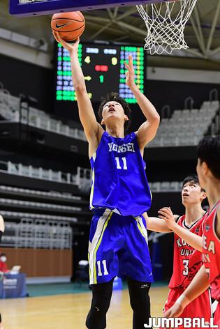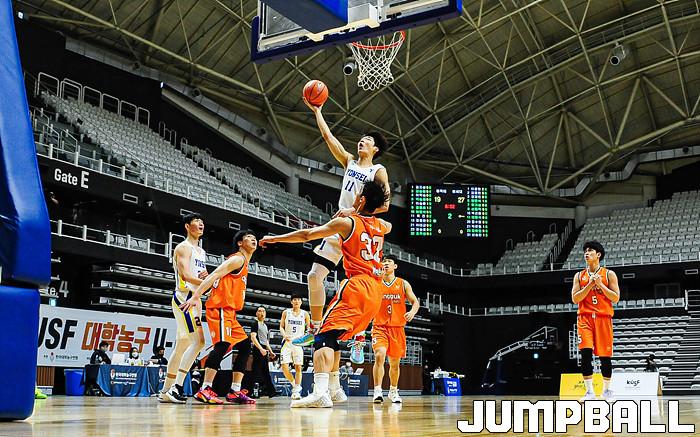 [점프볼=수원/박상혁 기자] 4일 서수원칠보체육관에서 열린 2021 KUSF 대학농구 U리그 연세대와 동국대의 경기, 연세대 이원석이 골밑에서 슛을 시도하고 있다.