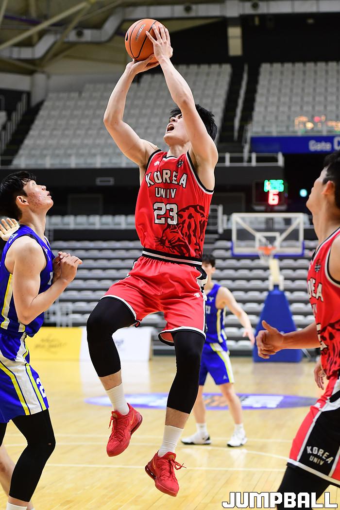 [점프볼=수원/박상혁 기자] 3일 서수원칠보체육관에서 열린 2021 KUSF 대학농구 U리그 연세대와 고려대 4강 플레이오프 경기, 고려대 이두원이 골밑슛을 시도하고 있다.