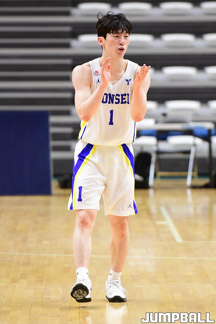 [점프볼=수원/박상혁 기자] 4일 서수원칠보체육관에서 열린 2021 KUSF 대학농구 U리그 연세대와 동국대의 경기, 연세대 이정현이 환호하고 있다.