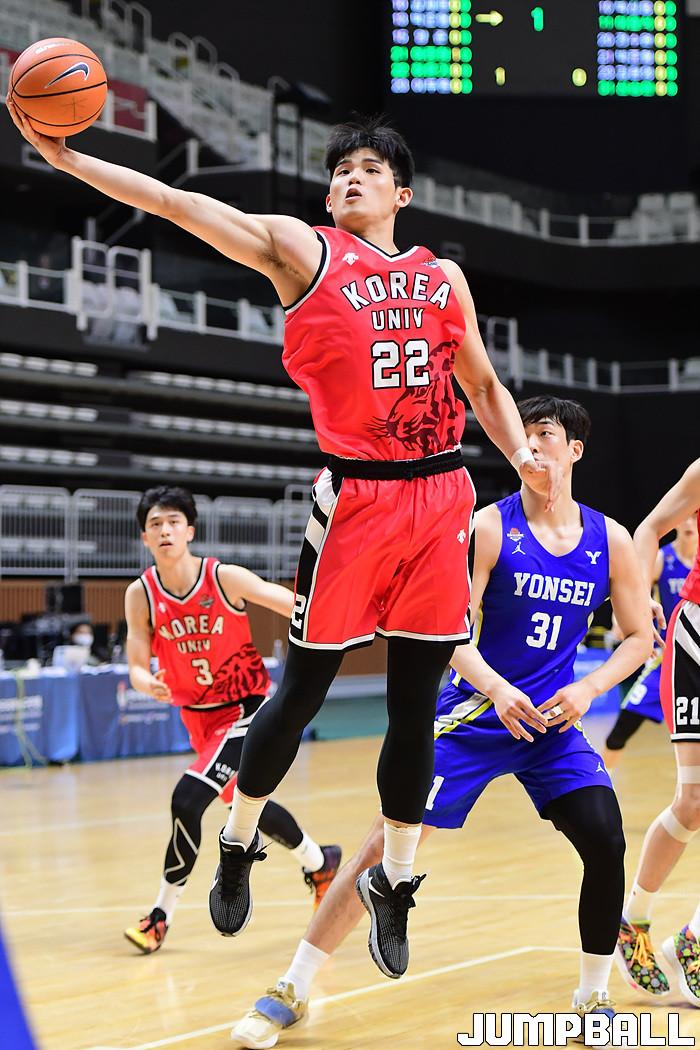 [점프볼=수원/박상혁 기자] 3일 서수원칠보체육관에서 열린 2021 KUSF 대학농구 U리그 연세대와 고려대 4강 플레이오프 경기, 고려대 하윤기가 리바운드를 잡아내고 있다.