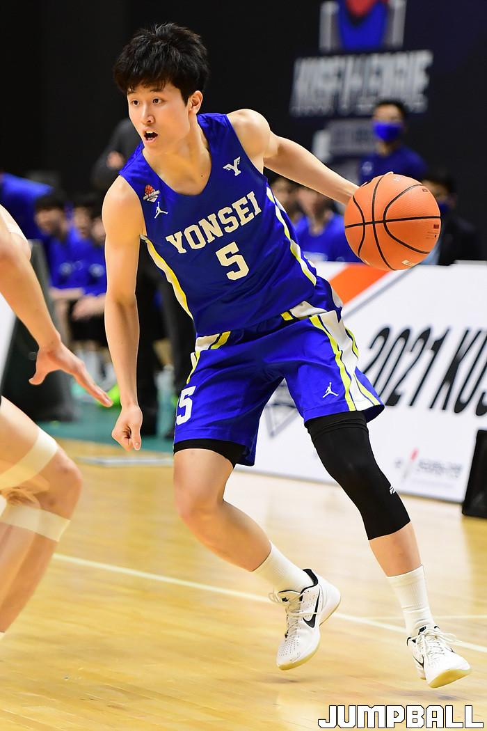 [점프볼=수원/박상혁 기자] 3일 서수원칠보체육관에서 열린 2021 KUSF 대학농구 U리그 연세대와 고려대 4강 플레이오프 경기, 연세대 양준석이 공격을 시도하고 있다.