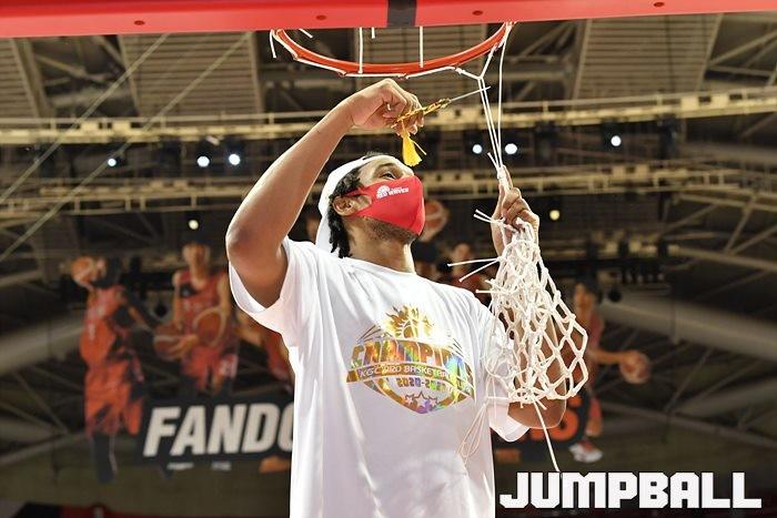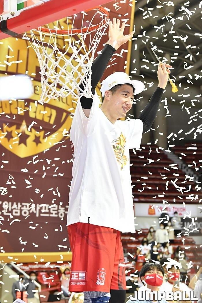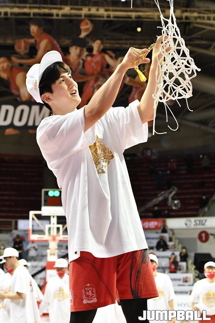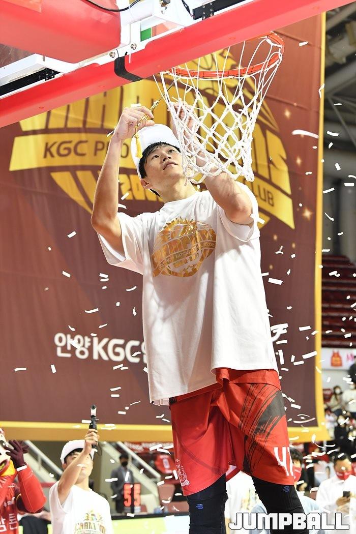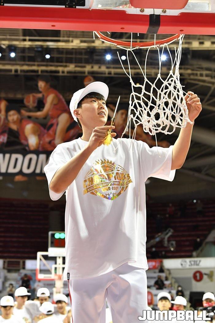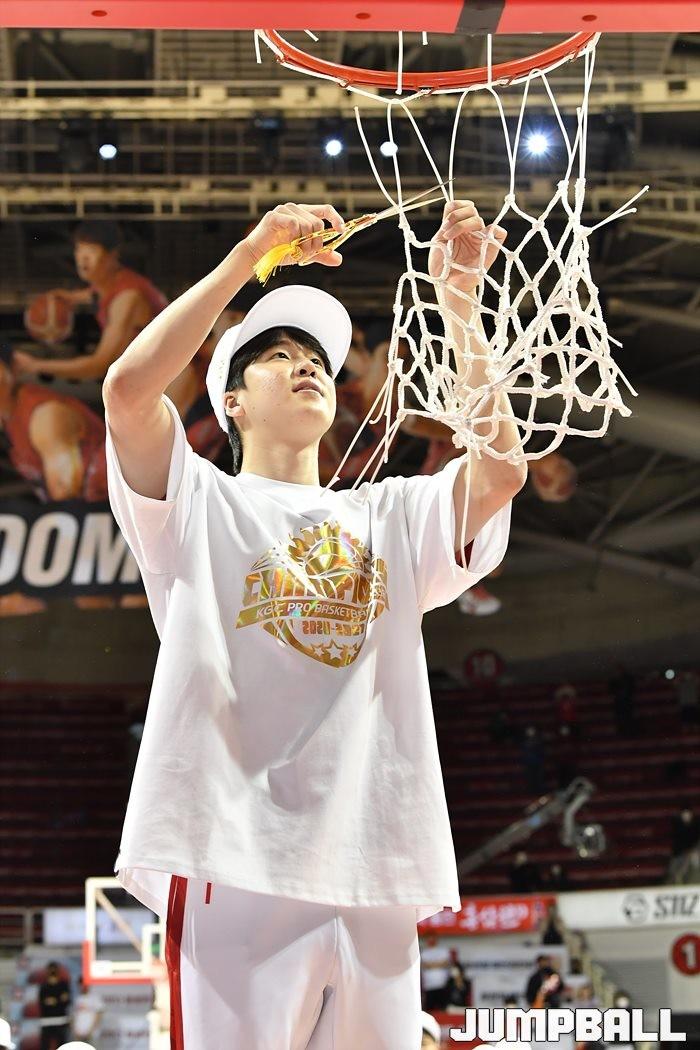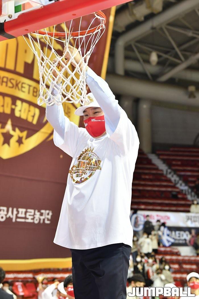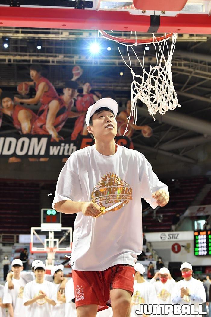 [점프볼=안양/유용우 기자] 안양 KGC인삼공사는 9일 안양실내체육관에서 열린 2020-2021 현대모비스 프로농구 전주 KCC와의 챔피언결정전 4차전에서 84-74로 승리하며 창단 후 세 번째 플레이오프 우승을 차지했다. KGC인삼공사 챔피언결정전 우승 세레머니, 그물망 커팅식 화보