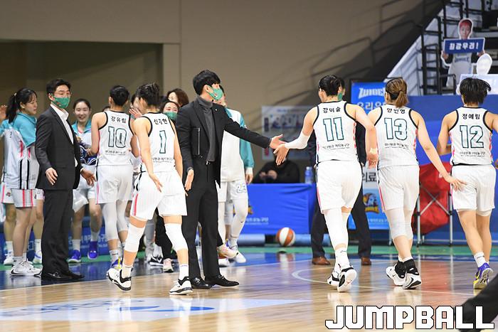 [점프볼=아산/박상혁 기자] 18일 아산이순신체육관에서 열린 'KB국민은행 Liiv M 2020-2021 여자프로농구' 우리은행과 하나원큐의 경기, 하나원큐 선수단이 득점에 성공한후 환호하고 있다.