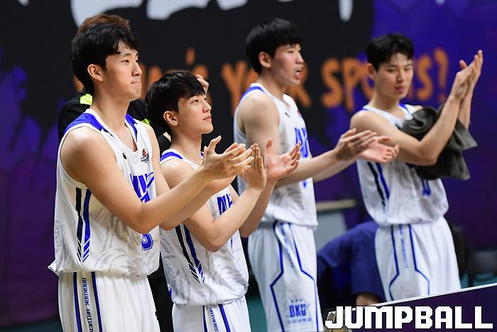 [점프볼=수원/박상혁 기자] 27일 서수원칠보체육관에서 열린 2021 KUSF 대학농구 U리그 단국대와 성균관대의 경기, 단국대 선수들이 환호하고 있다.