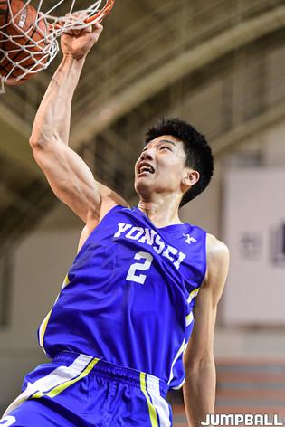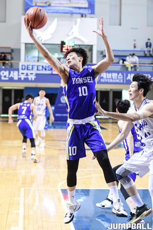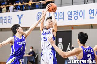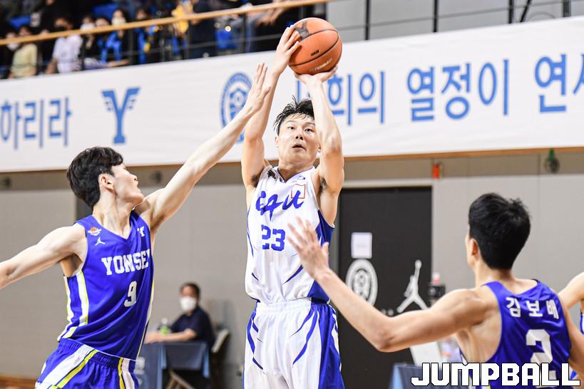 12일 연세대학교 신촌캠퍼스 체육관에서 열린 2022 KUSF 대학농구 U-리그 연세대와 중앙대의 경기, 중앙대 박인웅이 점프슛을 시도하고 있다.