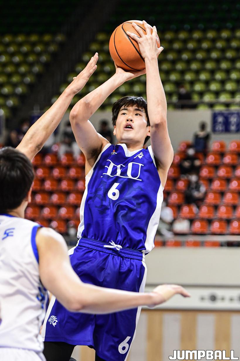 9일 한양대 서울캠퍼스 체육관에서 열린 2022 KUSF 대학농구 U리그 한양대와 명지대의 경기, 한양대 전준우가 슛을 시도하고 있다.