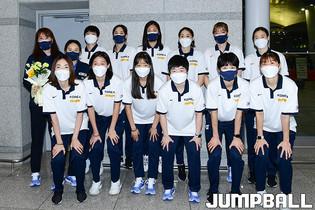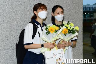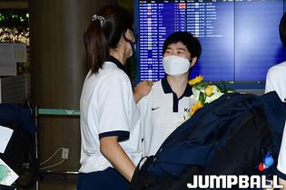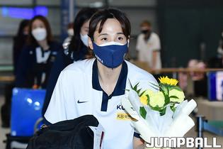 5일 인천국제공항 제1터미널로 2021 아시아컵 여자농구대표팀이 입국했다. 하나원큐 양인영이 입국장으로 들어와 꽃다발을 받고 있다.
