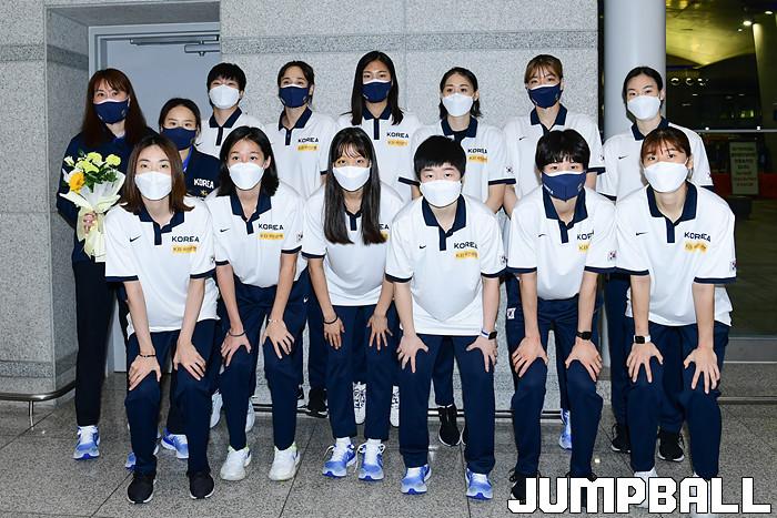 5일 인천국제공항 제1터미널로 2021 아시아컵 여자농구대표팀이 입국했다. 단체 사진 촬영을 하고 있다.