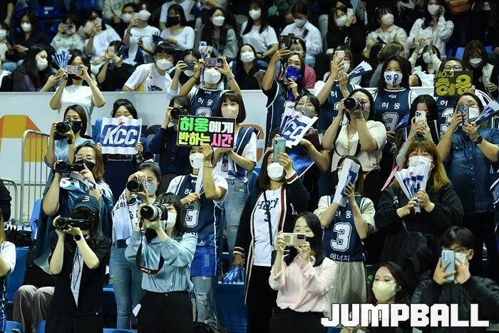 23일 전주실내체육관에서 열린 2022-2023 SKT 에이닷 프로농구 전주 KCC와 안양 KGC인삼공사의 경기, KCC가 99-93으로 KGC에 연장전 끝 승리를 거뒀다. 많은 허웅팬들이 승리 인터뷰하는 허웅을 응원하고 있다. [점프볼=전주/유용우 기자]