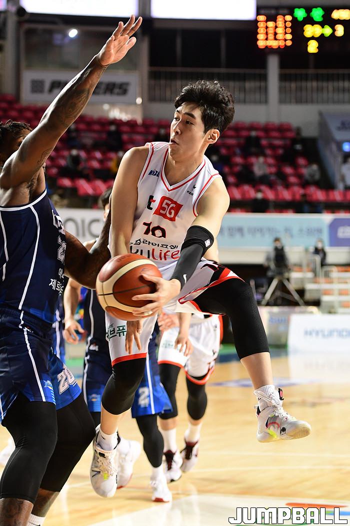 [점프볼=전주/박상혁 기자] 19일 전주실내체육관에서 열린 2020-2021 현대모비스 프로농구 전주 KCC와 부산 KT의 경기, KT 김종범이 골밑까지 들어와 패스를 시도하고 있다.
