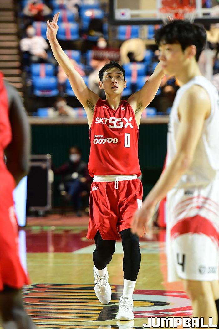 [점프볼=잠실학생/박상혁 기자] 24일 잠실학생체육관에서 열린 2020-2021 현대모비스 프로농구 서울 SK와 안양KGC인삼공사의 경기, SK 양우섭이 3점슛을 성공시킨후 세리머니를 하고 있다.