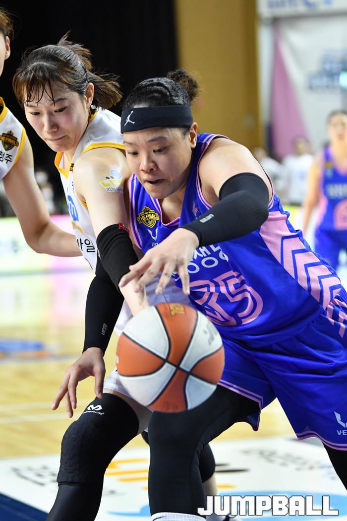[점프볼=용인/유용우 기자] 09일 용인실내체육관에서 열린 'KB국민은행 Liiv M 2020-2021 여자프로농구' 용인 삼성생명과 청주 KB의 챔피언결정전 2차전, 삼성생명 김한별이 KB 강아정과 루즈볼을 경합하고 있다.