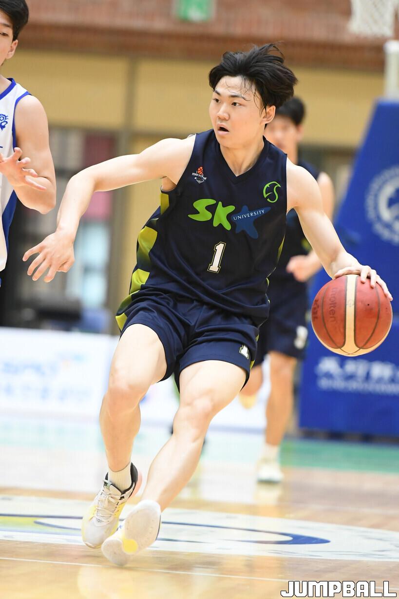 [점프볼=수원/박상혁 기자] 2일 성균관대학교 자연과학캠퍼스 수성관에서 열린 2024 KUSF 대학농구 U-리그 성균관대학교와 한양대의 경기, 성균관대 이건영이 속공 상황에서 잠시 멈추고 있다.