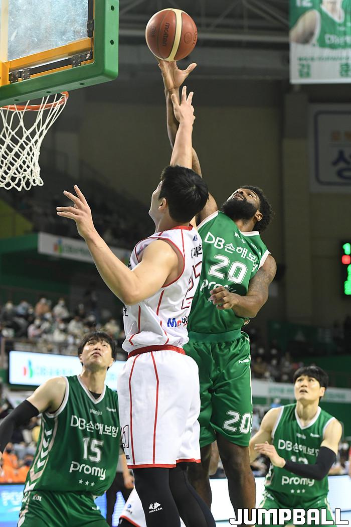 6일 강원도 원주에 위치한 원주종합체육관에서 열린 2021-2022 KGC인삼공사 정관장 프로농구 원주 DB와 대구 한국가스공사의 경기, DB 레나드 프리먼이 한국가스공사 이대헌의 슛을 막아내고 있다.