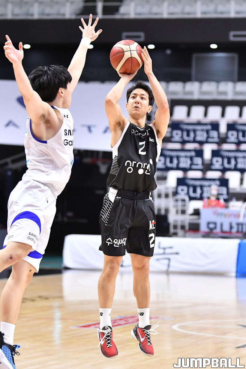 15일 수원 KT 소닉붐 아레나에서 열린 2021-2022 KGC인삼공사 정관장 프로농구 수원 KT와 서울 삼성 경기. KT 허훈이 스텝백으로 간격을 만든뒤 3점슛을 던지고 있다.