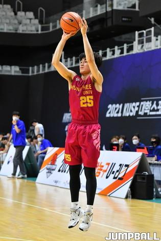 [점프볼=수원/홍기웅 기자] 13일 수원 서수원칠보체육관에서 열린 '2021 KUSF 대학농구 U-리그 3차대회' 성균관대와 한양대의 경기. 한양대 김민진이 점프슛을 던지고 있다.