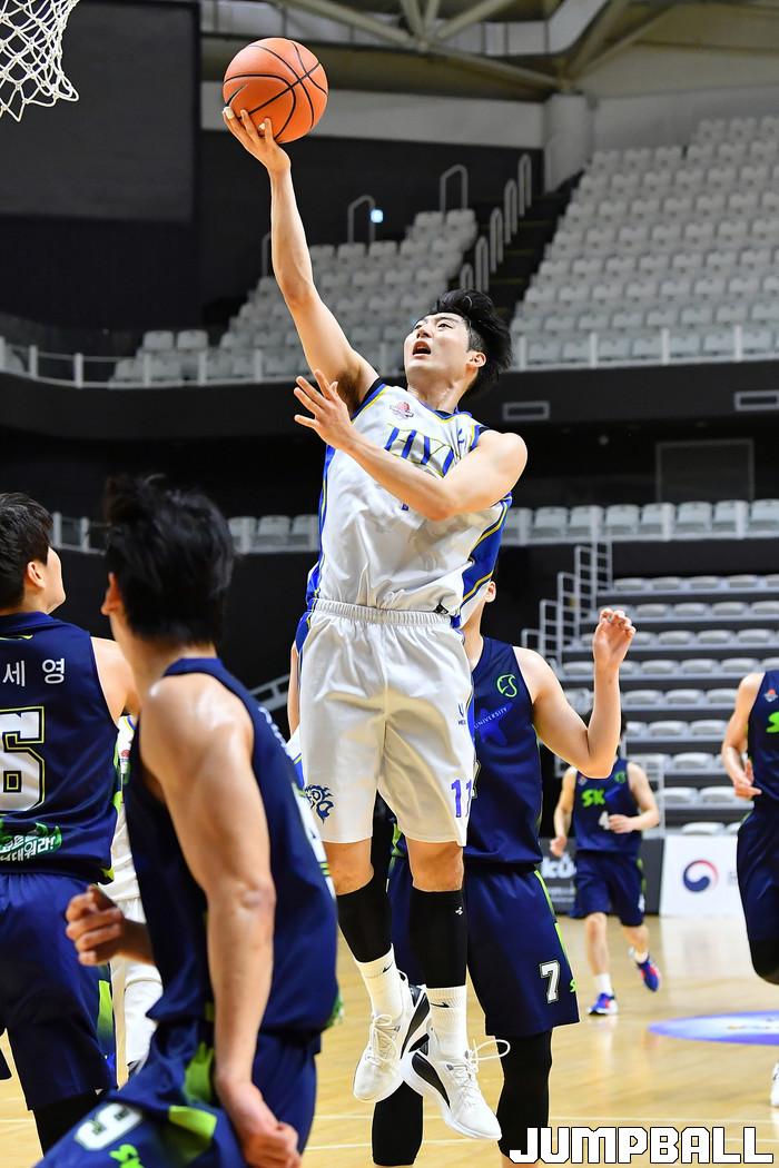 [점프볼=수원/홍기웅 기자] 13일 수원 서수원칠보체육관에서 열린 '2021 KUSF 대학농구 U-리그 3차대회' 성균관대와 한양대의 경기. 한양대 김형준이 수비 앞에서 레이업을 올려넣고 있다.
