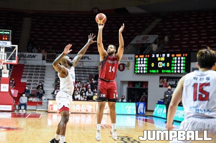 19일 안양실내체육관에서 열린 2021-2022 KGC인삼공사 정관장 프로농구 안양 KGC인삼공사와 고양 오리온의 경기, KGC 스펠맨이 상대 수비를 피해 3점슛을 시도하고 있다.