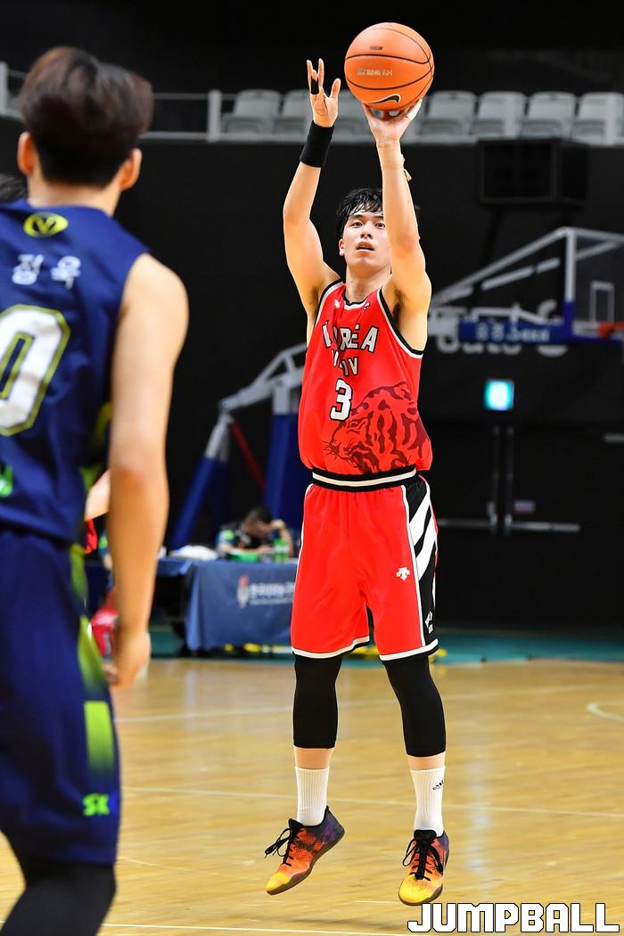 [점프볼=수원/홍기웅 기자] 14일 수원 서수원칠보체육관에서 열린 '2021 KUSF 대학농구 U-리그 3차대회' 성균관대와 고려대의 4강 경기. 고려대 박무빈이 3점슛을 던지고 있다.