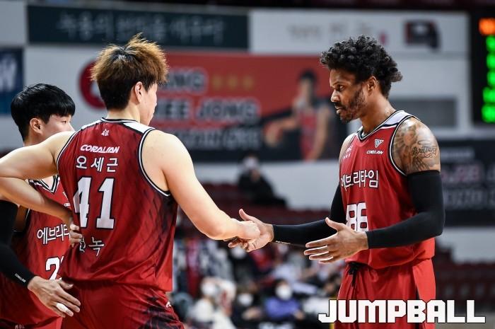 19일 안양실내체육관에서 열린 2021-2022 KGC인삼공사 정관장 프로농구 안양 KGC인삼공사와 고양 오리온의 경기, KGC 먼로가 득점에 성공한 오세근과 하이파이브를 나누고 있다.