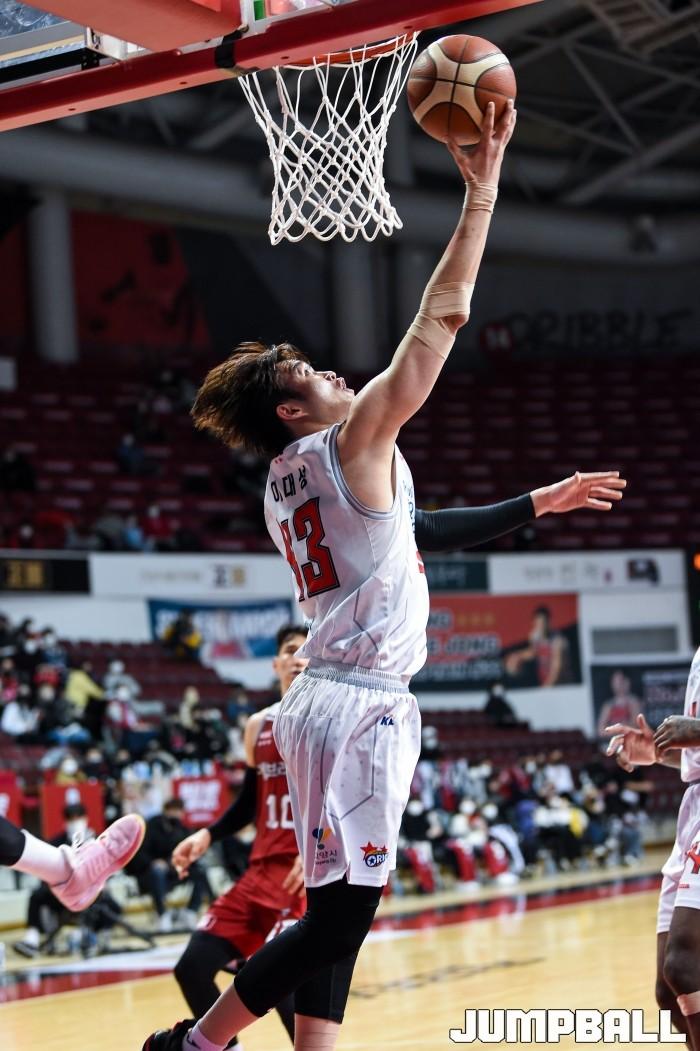 19일 안양실내체육관에서 열린 2021-2022 KGC인삼공사 정관장 프로농구 안양 KGC인삼공사와 고양 오리온의 경기, 오리온 이대성이 상대 수비를 벗겨낸 후 리버스 레이업 슛을 시도하고 있다.