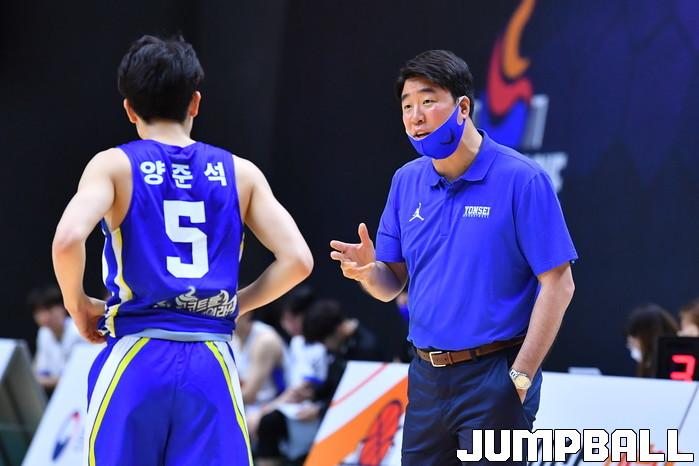 [점프볼=수원/홍기웅 기자] 5일 수원 서수원칠보체육관에서 열린 '2021 KUSF 대학농구 U-리그 3차대회' 연세대와 한양대의 경기. 연세대 은희석 감독이 양준석에게 개인 지시를 내리고 있다.