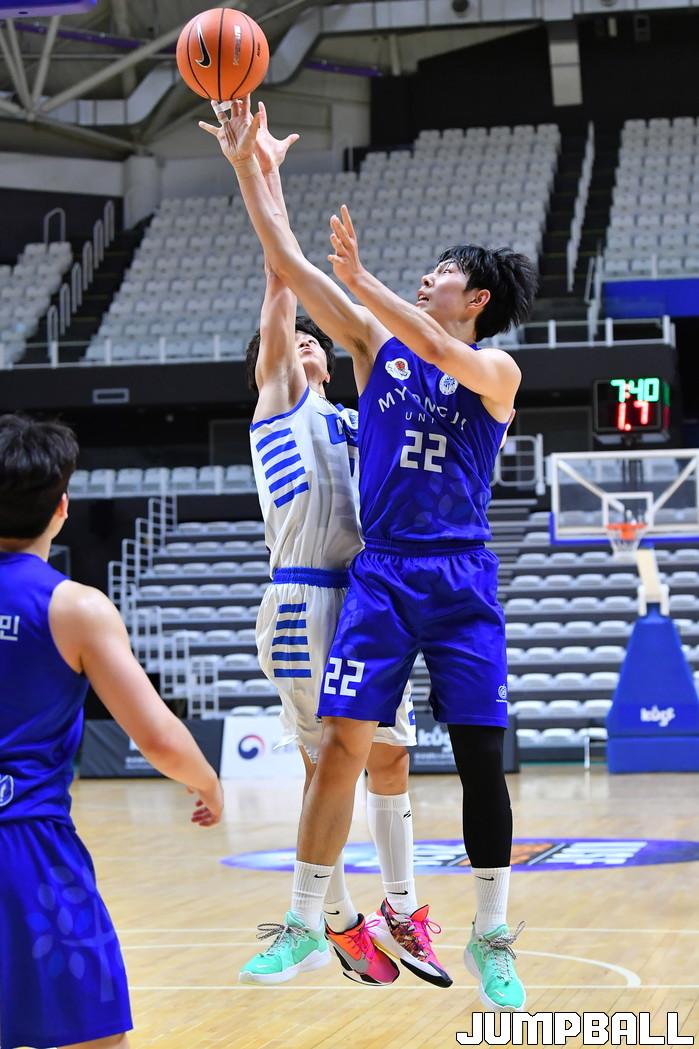 [점프볼=수원/홍기웅 기자] 6일 수원 서수원칠보체육관에서 열린 '2021 KUSF 대학농구 U-리그 3차대회' 명지대와 조선대의 경기. 명지대 엄윤혁이 골밑슛을 던지고 있다.