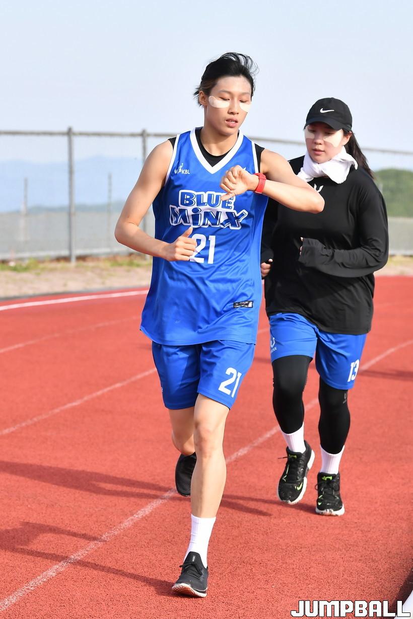 2일 태백선수촌 트랙훈련장에서 여자프로농구 삼성생명이 트랙 훈련을 진행했다. 삼성생명 이해란이 러닝 도중 자신의 러닝 기록과 심박수를 체크하고 있다.