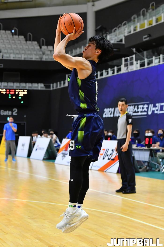 [점프볼=수원/홍기웅 기자] 13일 수원 서수원칠보체육관에서 열린 '2021 KUSF 대학농구 U-리그 3차대회' 성균관대와 한양대의 경기. 성균관대 김수환이 점프슛을 던지고 있다.