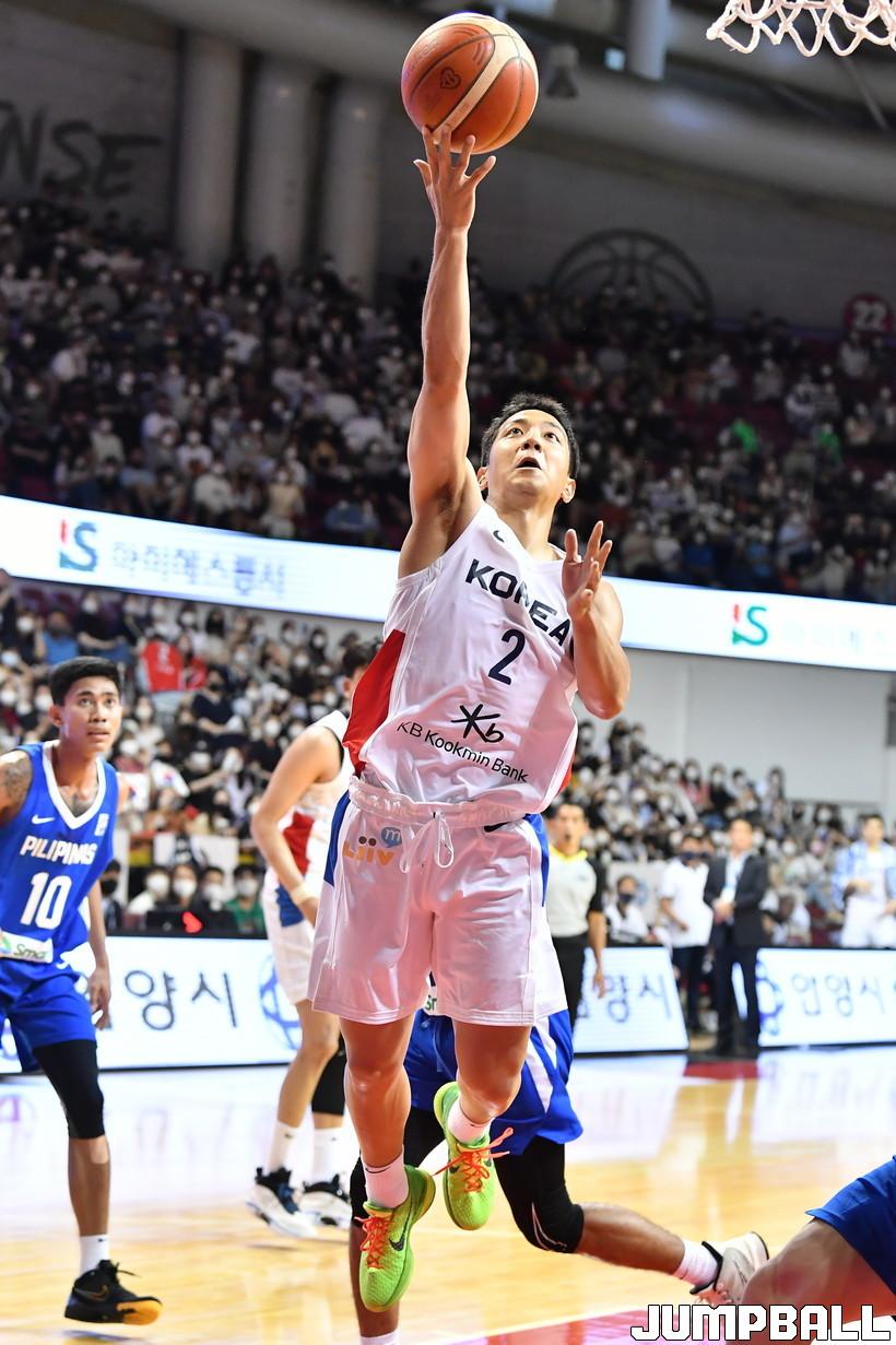 17일 안양실내체육관에서 열린 KB국민은행 초청 2022 남자농구 국가대표 평가전 대한민국과 필리핀의 경기. 대한민국 허훈이 레이업을 올려넣고 있다.