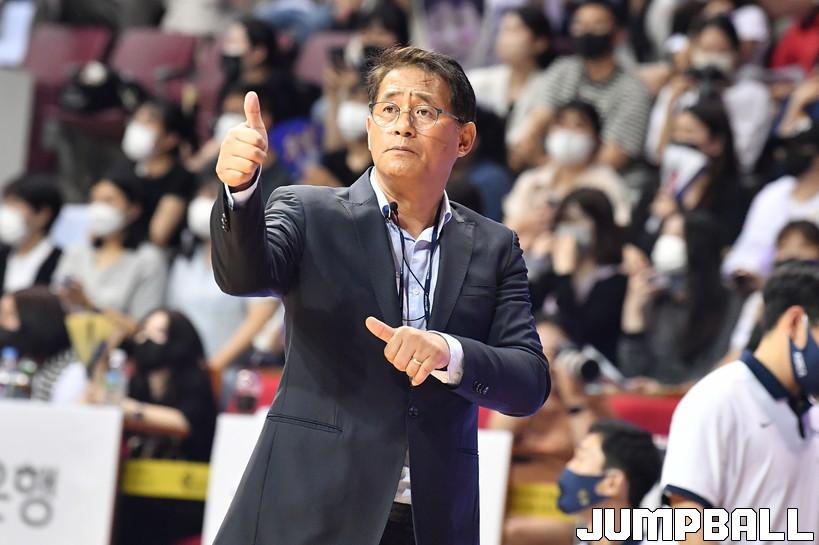 17일 안양실내체육관에서 열린 KB국민은행 초청 2022 남자농구 국가대표 평가전 대한민국과 필리핀의 경기. 대한민국 추일승 감독이 코트 위 선수를 향해 엄지를 치켜 올리고 있다.